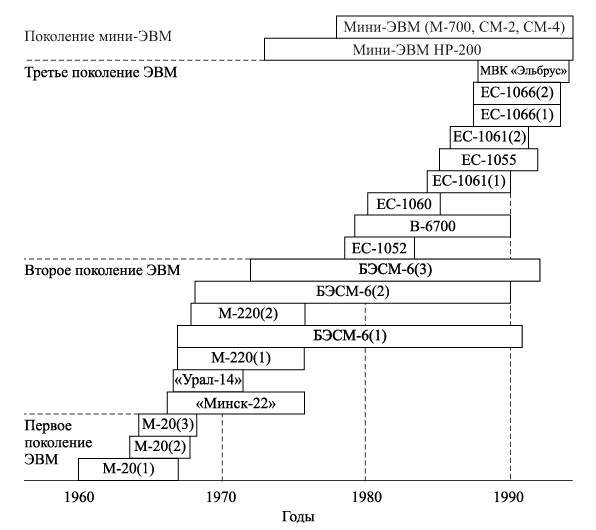 В качестве наглядного примера обновления поколений ЭВМ и эволюции компьютерной техники в Советском Союзе представим интересную временную диаграмму установки и смены ЭВМ в Вычислительном центре Сибирского отделения Академии наук СССР (ВЦ СО АН СССР) (рис. 1.1) [5].